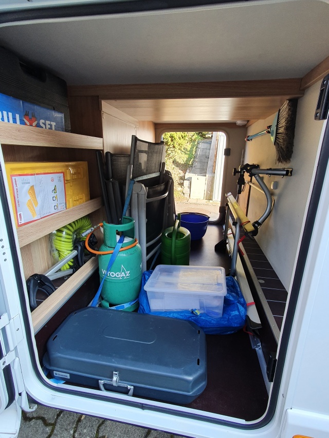 - Geschirr, Campingstühle, Tisch, Grill sowie Gas.